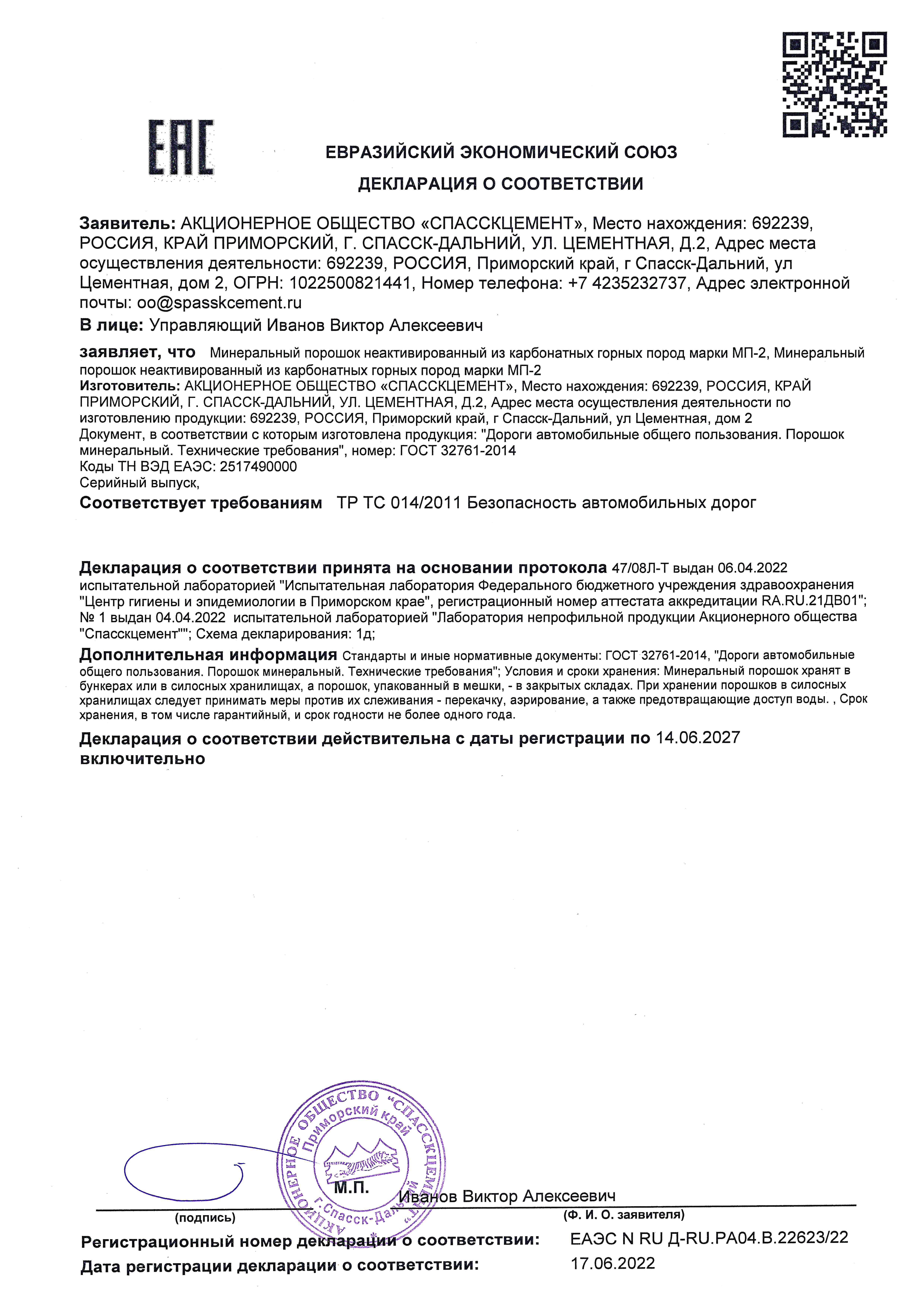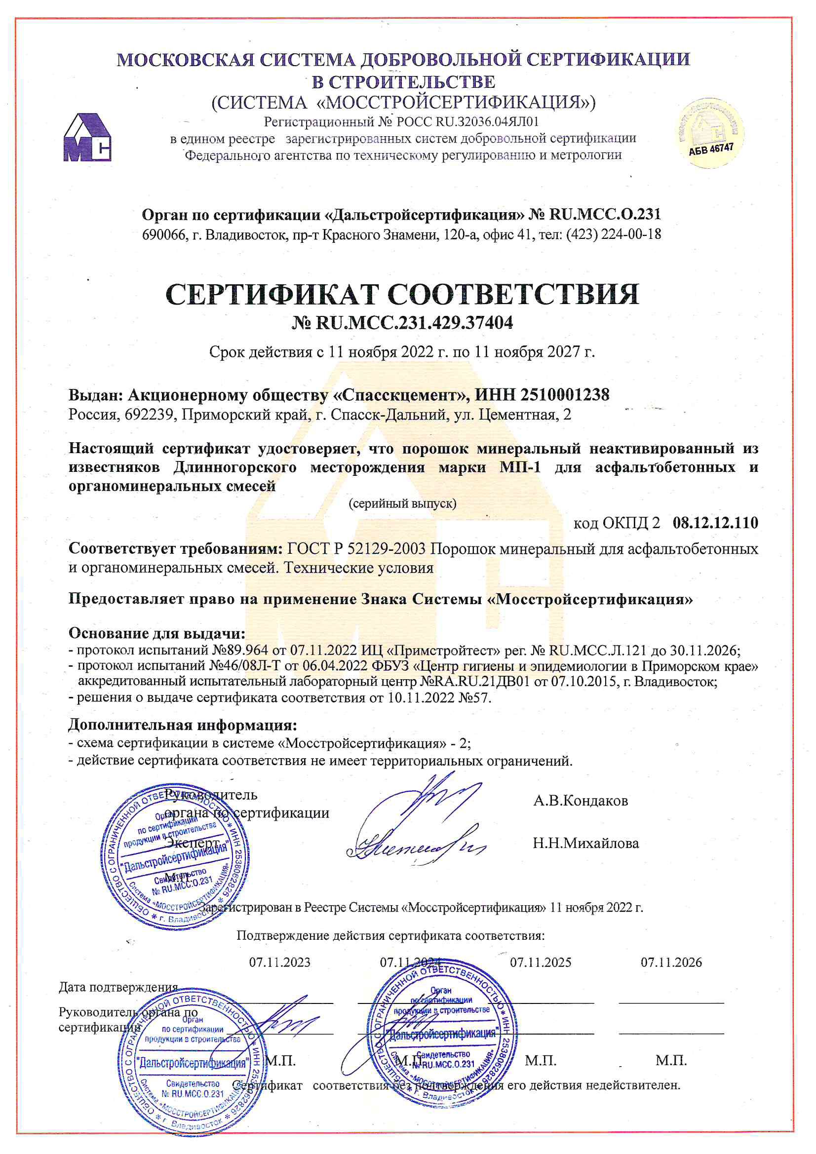 Качество спасского цемента соответствует российским и международным стандартам. Разработка и внедрение новой продукции проходит в тесном сотрудничестве с ведущими научными отраслевыми институтами. С 2014 года завод АО «Спасскцемент» перешел на новый стандарт по цементу ГОСТ 31108-2003 (на данный момент 31108-2020) и уже начал отпуск продукции по данному ГОСТу.